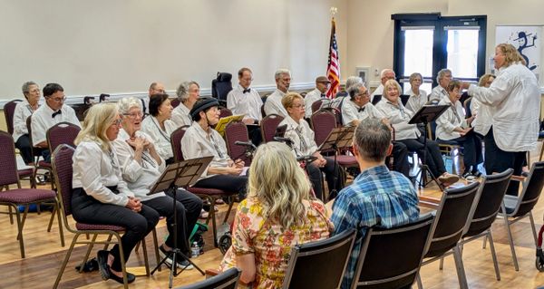 The photograph above shows Music Director Merri Zohar leading the Original Tremble Clefs at the Terraces, Phoenix, an independent living facility, on April 9, 2026. While Merri Zohar is directing, their accompanist Jihyeon Ryu is not pictured.