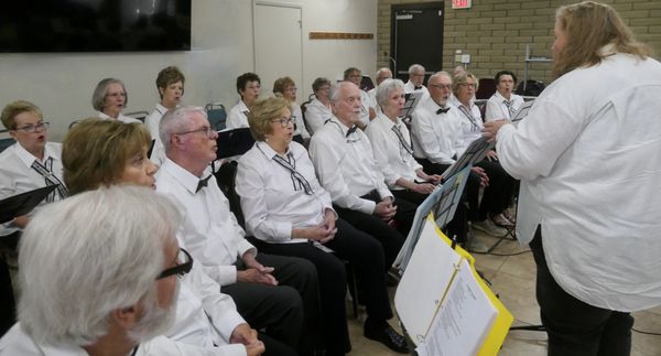 The photograph above shows Music Director Merri Zohar leading the Mesa Tremble Clefs in their annual concert at Venture Out RV Resort, Mesa, March 31, 2025. Singers from the Original Tremble Clefs and Sun Lakes joined them in this successful performance. Not shown in the photograph is their accompanist Linus Jung.