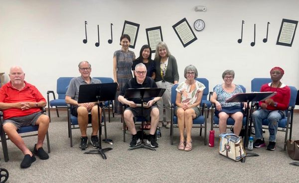 This photograph was taken on July 18, 2025, at a meeting of the Sun Lakes Tremble Clefs. It was a regular music therapy meeting where director Carolyn Perkins and accompanist Mutusmi Mori and their singers were joined by a special visitor, Sun Joo Lee.